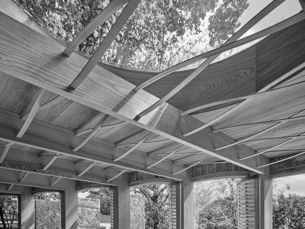 Physically non-committal in a different way, this stunning synthesis of landscape (garden) and architecture (potting shed) from Studio Weave, Tom Massey, and Sebastian Cox existed only for a few days in May as a highlight of the Royal Horticultural Society’s (RHS) annual Chelsea Flower Show; though it is understood it could find a permanent home in Manchester’s Mayfield Park – cross your fingers / or perhaps in this case your salvaged ash-wooden truss straps (!). Sponsored by AI group, Avanade, this project showcases how Large Language Models (or LLMs) can be used to monitor and support the health of urban tree. The shed utilises home-grown mycelium (a strain of fungus grown especially for construction) for its cladding. This is a notable reference to the ‘neural pathways’ that AI technologies are built on. Meanwhile, wood from felled trees that had succumbed to the fatal ‘ash dieback’ disease was used to form a woven framework, demonstrating innovation in timber structures.