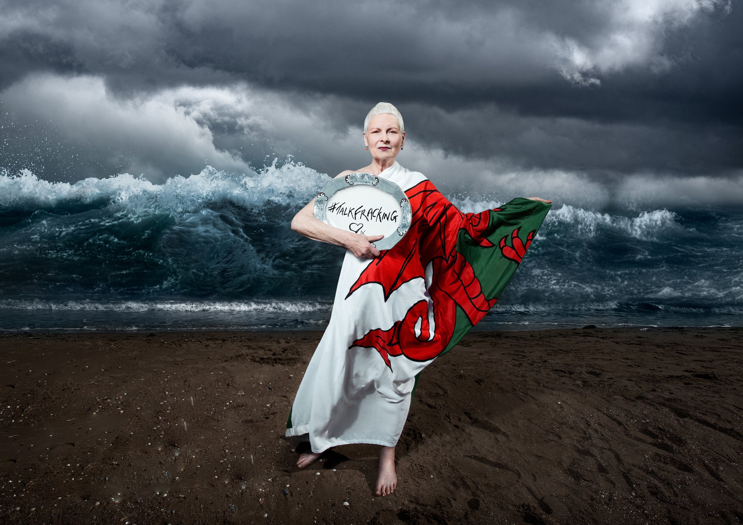 Talk Fracking, Swansea Beach, Gower Peninsula, Wales, June 2014. Westwood on Swansea Beach holding a charity-shop plate on which she wrote the words “Talk Fracking”. Shot during the 2014 anti-fracking campaign this remains my favourite and most iconic image I made of Vivienne. Photo: Ki Price